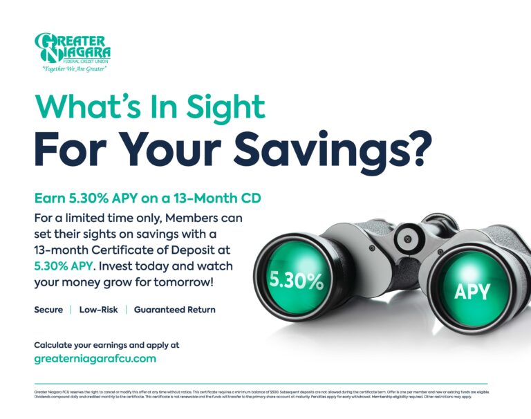 For a limited time only, Greater Niagara FCU is offering its own Certificate of Deposit offer at 5.30% APY for 13 months.